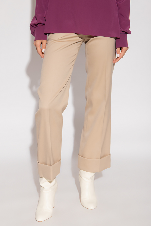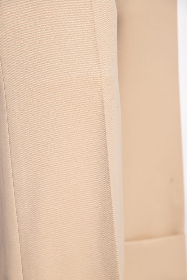 Beige pleat-front trousers from Lanvin. Made of wool. Fastened with a zip, button and decorative logo-engraved snap, two front pockets, two buttoned back pockets and straight leg jeans.