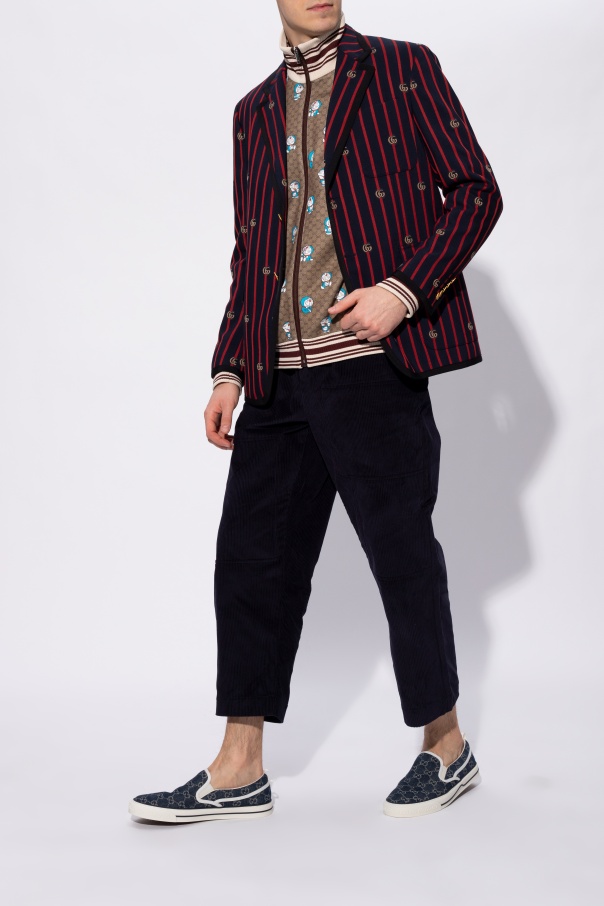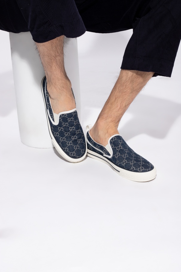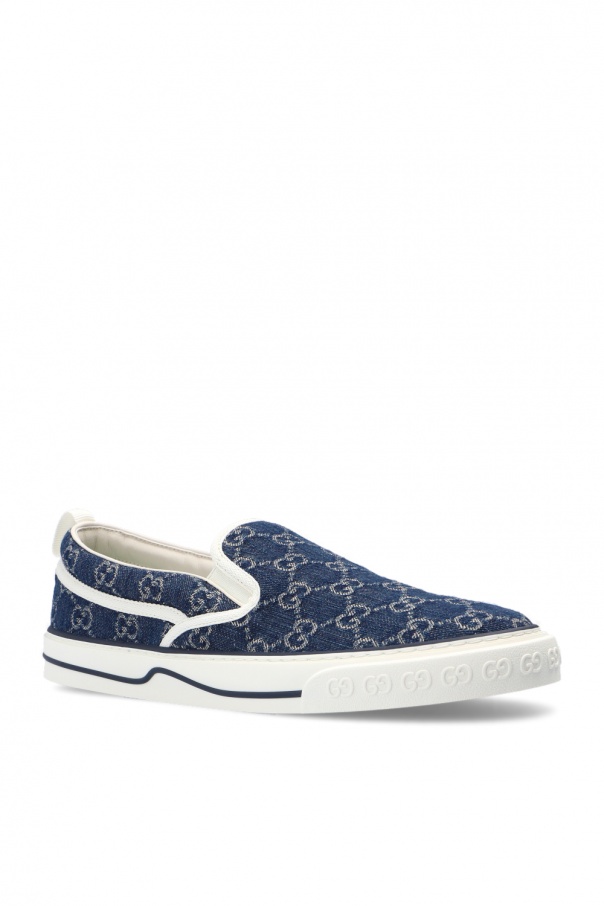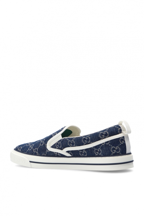Navy and white slip-on shoes from Gucci. Crafted from logo-embroidered denim, this pair is set on a rubber sole in brown, white and navy.