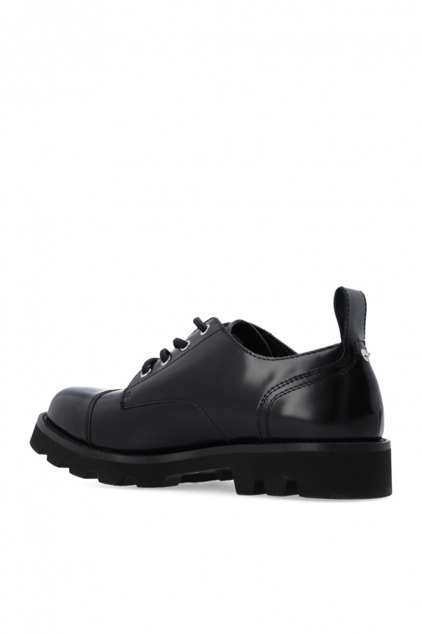 Black \'D-Konba\' shoes from Diesel. Made of patent cow leather, this lace-up model features a metal logo plaque on the back and a chunky black sole in EVA.