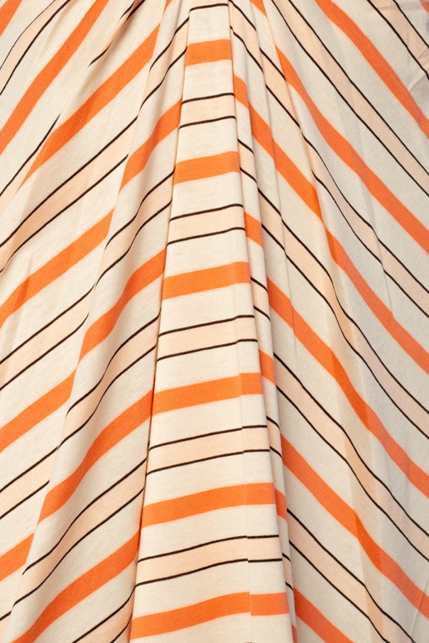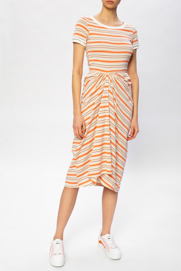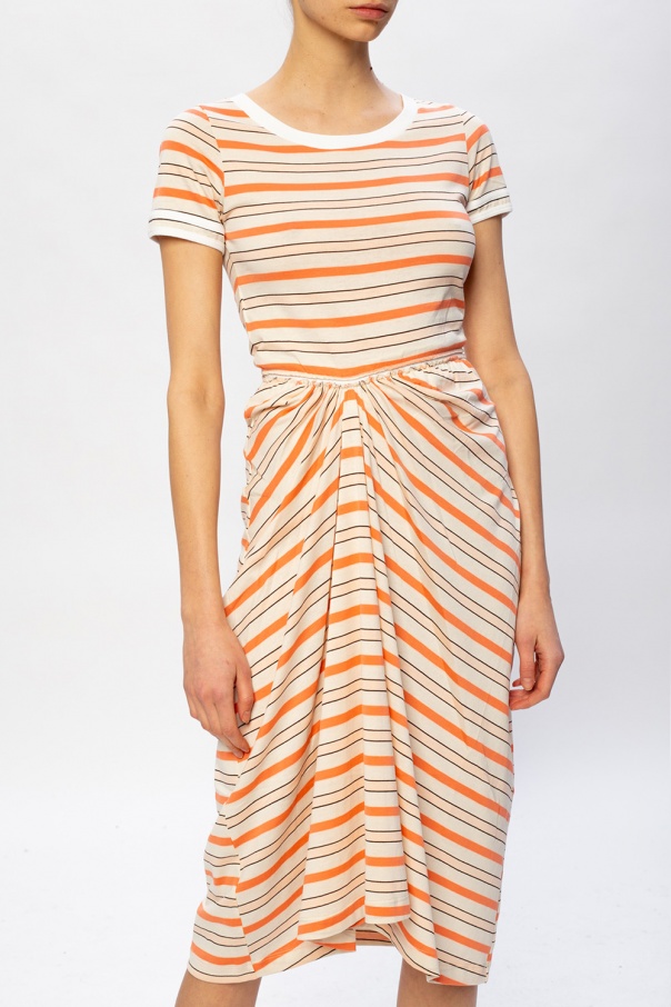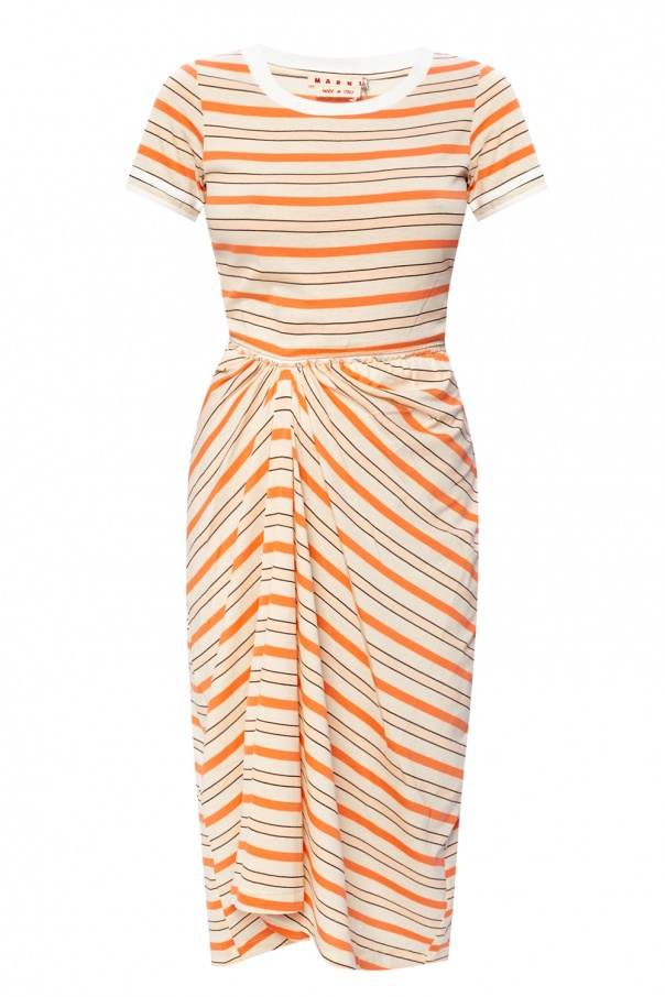 Beige and orange dress from Marni. Crafted from cotton with stripes throughout, this style is complete with a round neck, short sleeves and an elasticated trim at the waist.