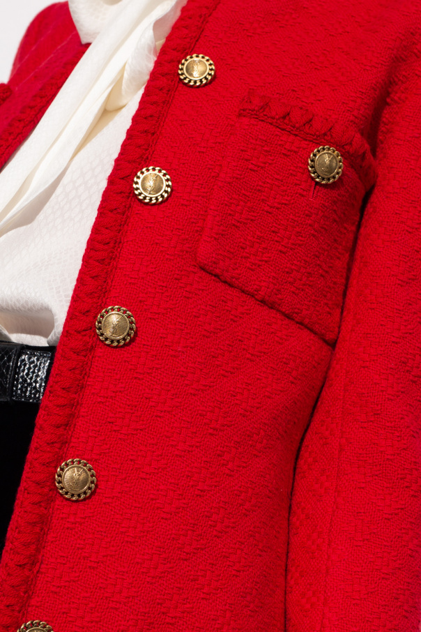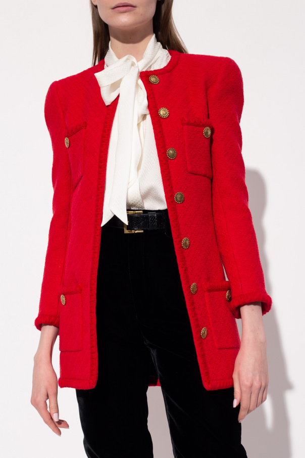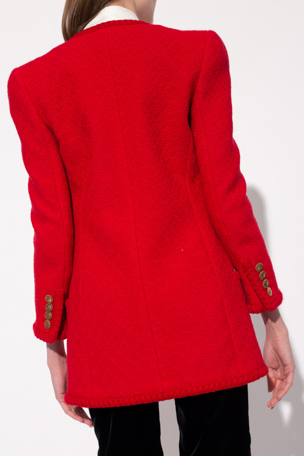 Red long tweed blazer from Saint Laurent. Accentuated with woven trim details, this style features distinctive antiqued gold-tone buttons, four button pockets, long sleeves and padded shoulders.