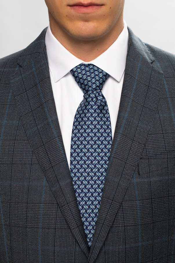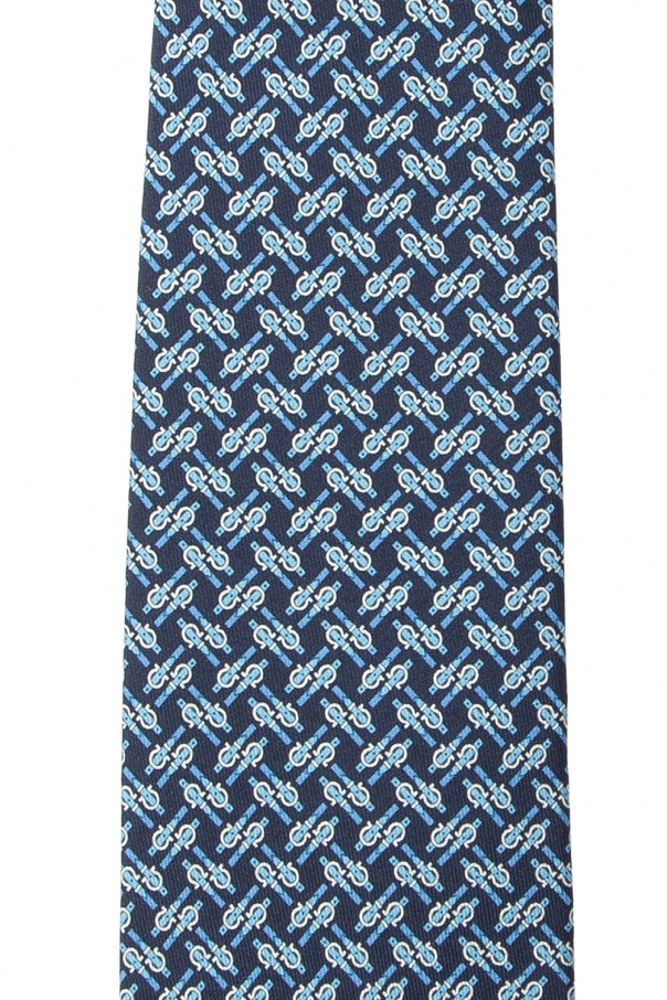Navy tie from Salvatore Ferragamo. Crafted from 100% silk, this exquisite accessory comes embellished with a logo pattern in light blue and white.