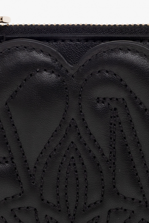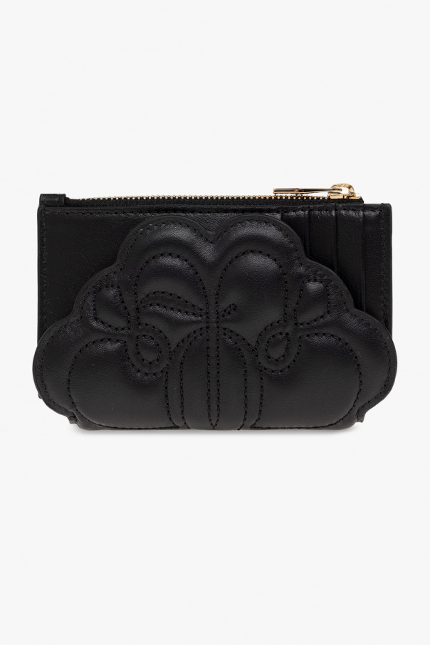 Black card case from Alexander McQueen. Crafted from calf leather, this item features a flap with the brand\'s signature ‘Seal’ motif, one zip coin pocket, eight card slots and gold-tone metal hardware.