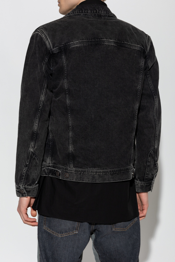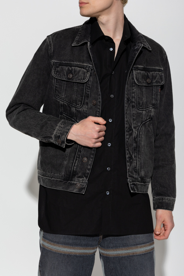 Dark grey \'D-RILEY\' denim jacket from Diesel. Made of cotton, this long sleeve design features button fastenings, worn effect, red logo embroidery, two slip pockets and two flap pockets.