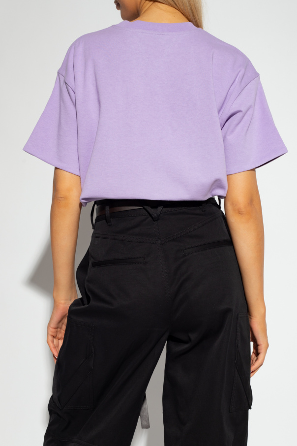 Light purple crewneck T-shirt from Bottega Veneta. Made from cotton, this style features short sleeves, an elasticated collar, a brown lining and logo embroidery accompanied by a distinctive triangular seam at the back.