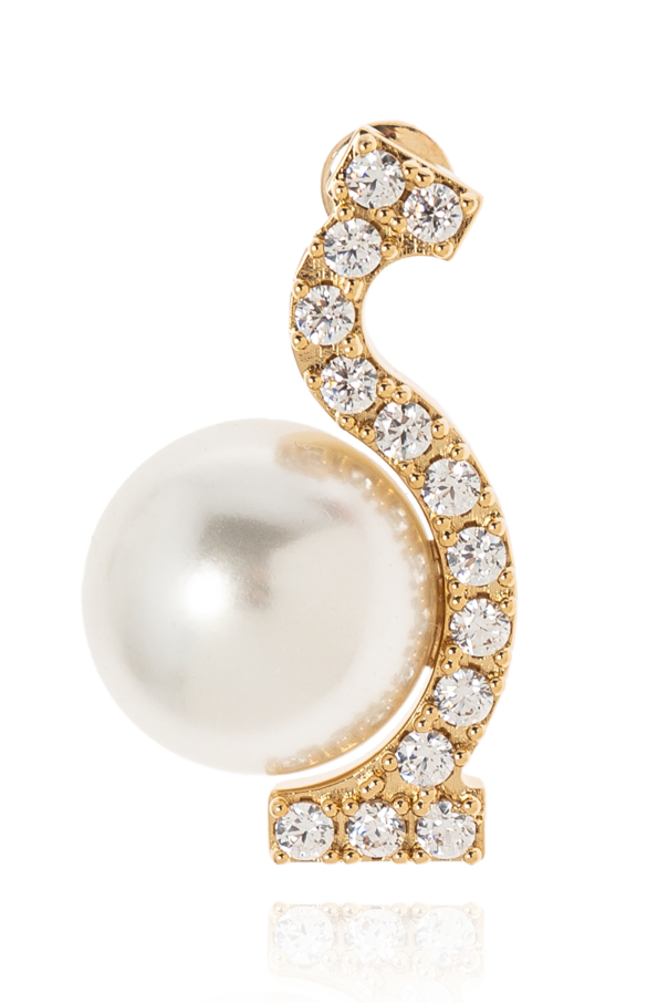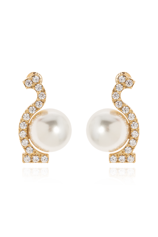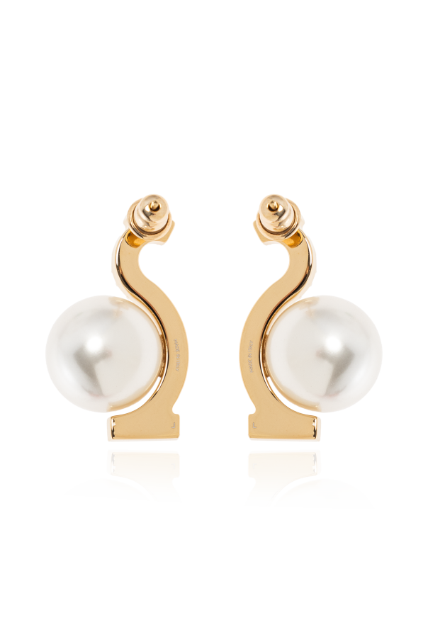 Introducing the Kolczyki z połyskującymi kryształami from the exclusive collection by the renowned Italian designer FERRAGAMO. Crafted with meticulous attention to detail, these luxurious earrings are a testament to the brand\'s commitment to elegance and sophistication. The earrings feature a unique shape, reminiscent of a stylized figure with a curved apex, culminating in a large, lustrous pearl at the center. The gold-toned metal is adorned with shimmering crystals, expertly arranged to accentuate the curved design, adding a touch of brilliance and luxury. Enhanced with robust clasps, these earrings promise stability and comfort, ensuring they remain a steadfast companion, whether worn for an evening gala or a sophisticated soiree. The dominant gold color exudes exclusivity and elegance, making them an impeccable choice for those seeking refined and elegant jewelry. Why Choose This Product? Exquisite design featuring a stylized figure with a curved apex. Crafted from gold-toned metal with shimmering crystals. Centrally placed lustrous pearl for added opulence. Robust clasps ensure stability and comfort. Perfect for adding class and brilliance to any occasion.