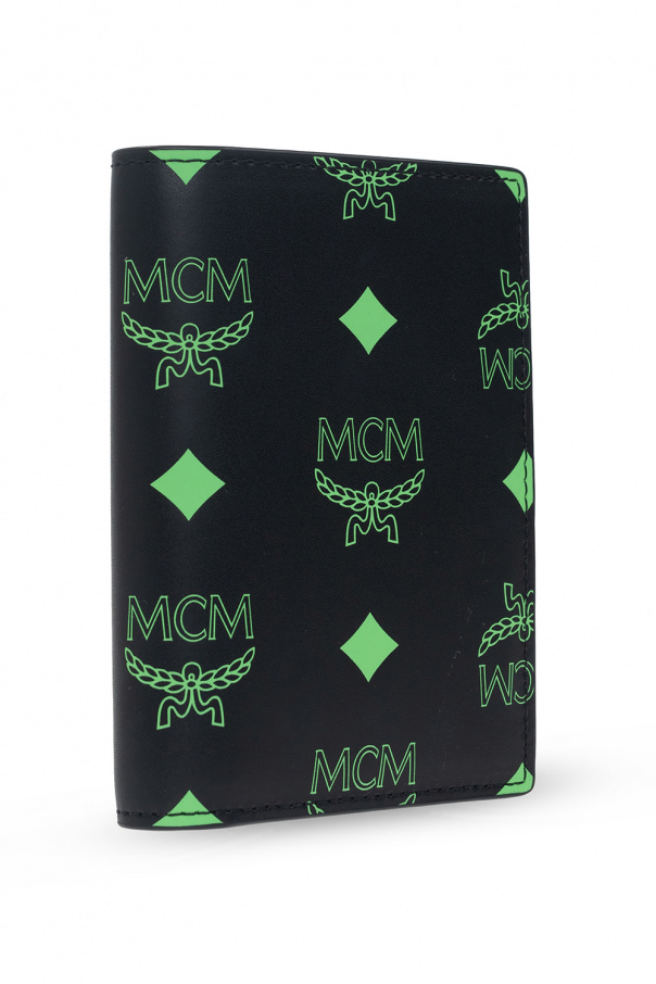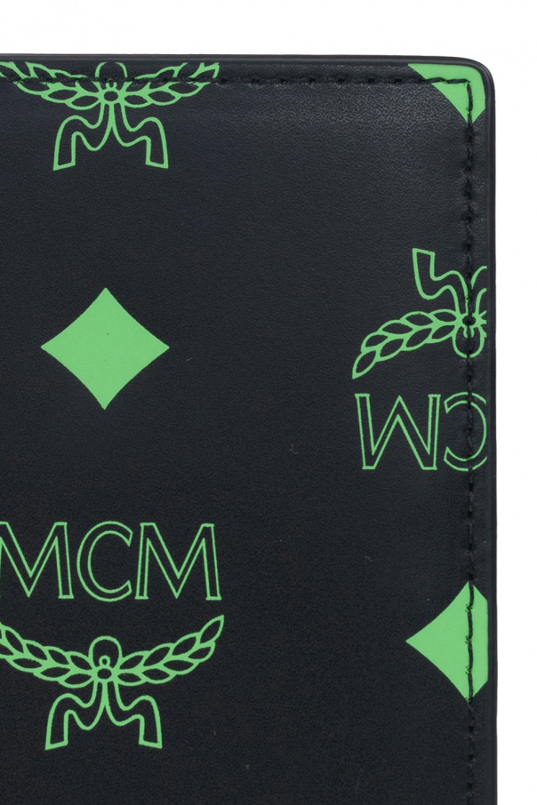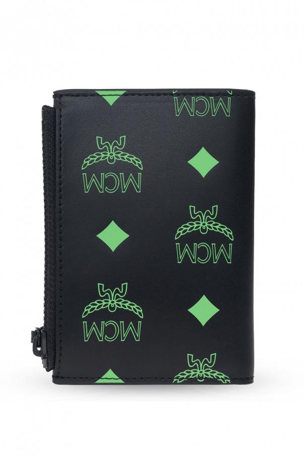 Black wallet from MCM. Embellished with a light green logo motif, this design features a snap fastening and a zipped coin pocket, two slip pockets, eight card slots and a bill compartment inside.