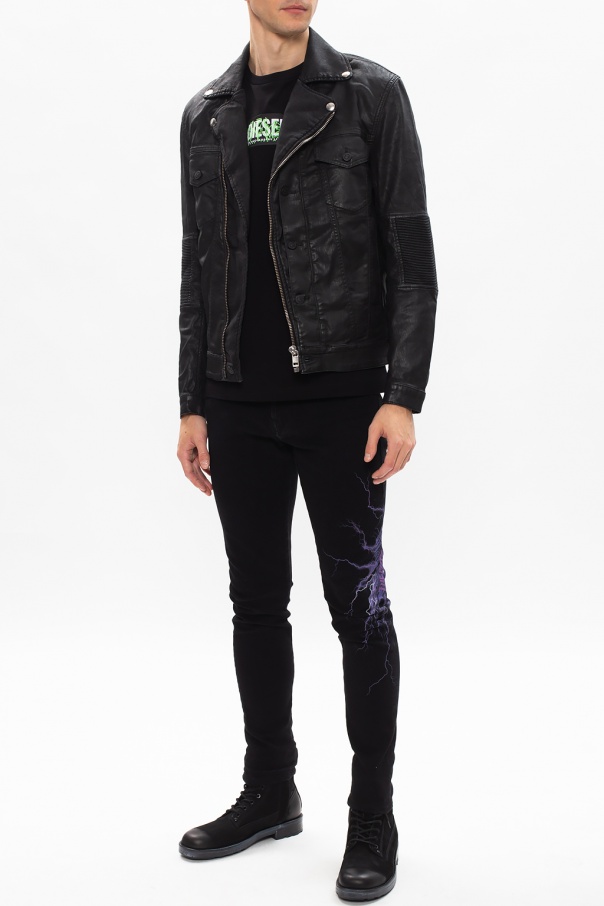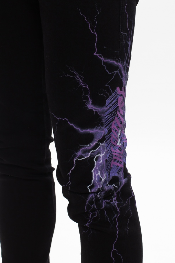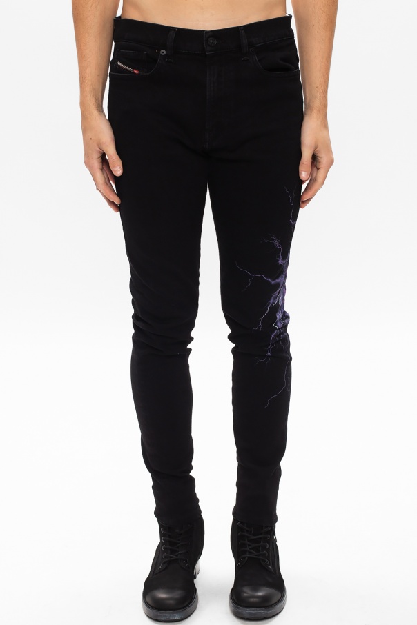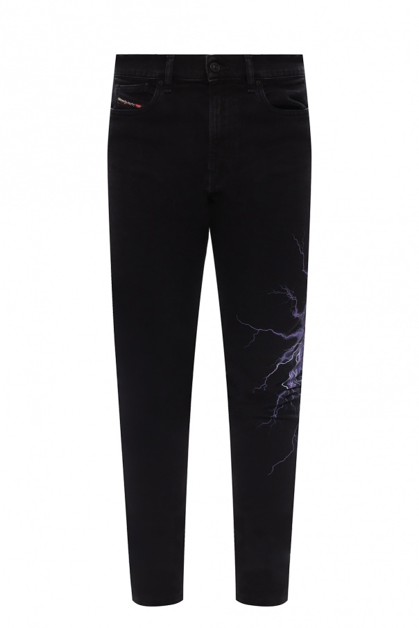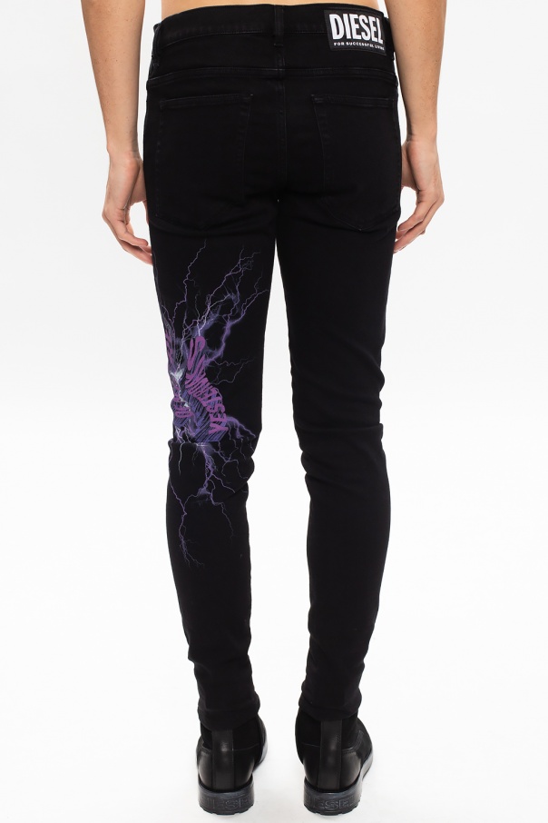 Navy blue \'D-Amny\' jeans from Diesel. Crafted from stretch cotton fabric with distressed effects, this pair falls down with legs that taper towards the ankles and showcases zip fly, button fastening, classic five pockets as well as logo patches and a purple and white graphic print.