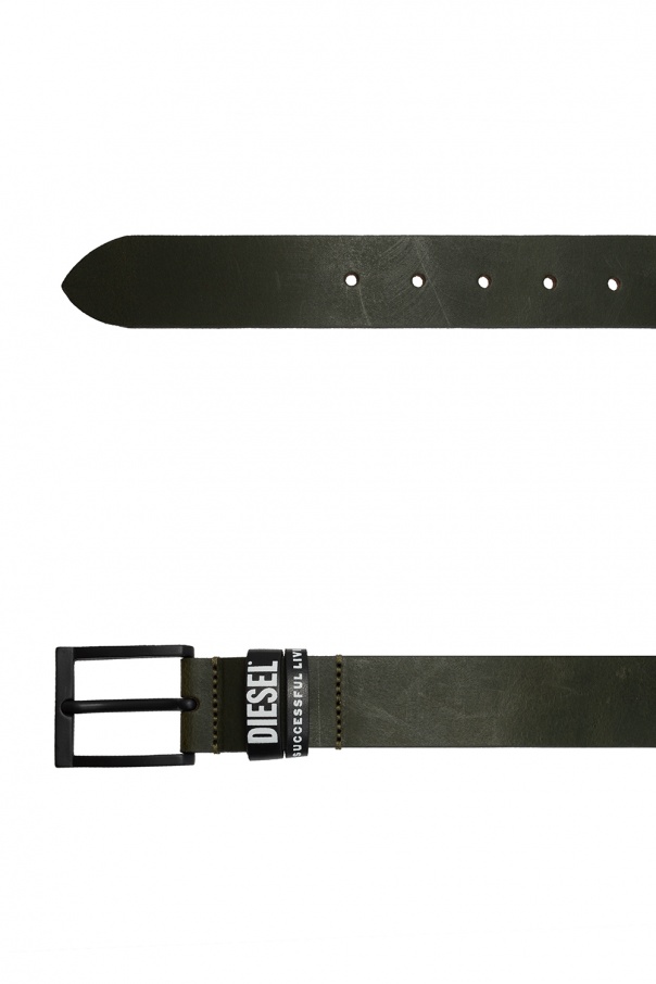 Dark green ‘B-Elen’ belt from Diesel. Crafted from leather, this item features a black buckle and a white logo.