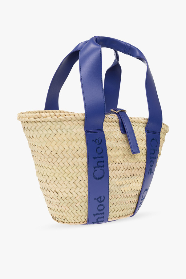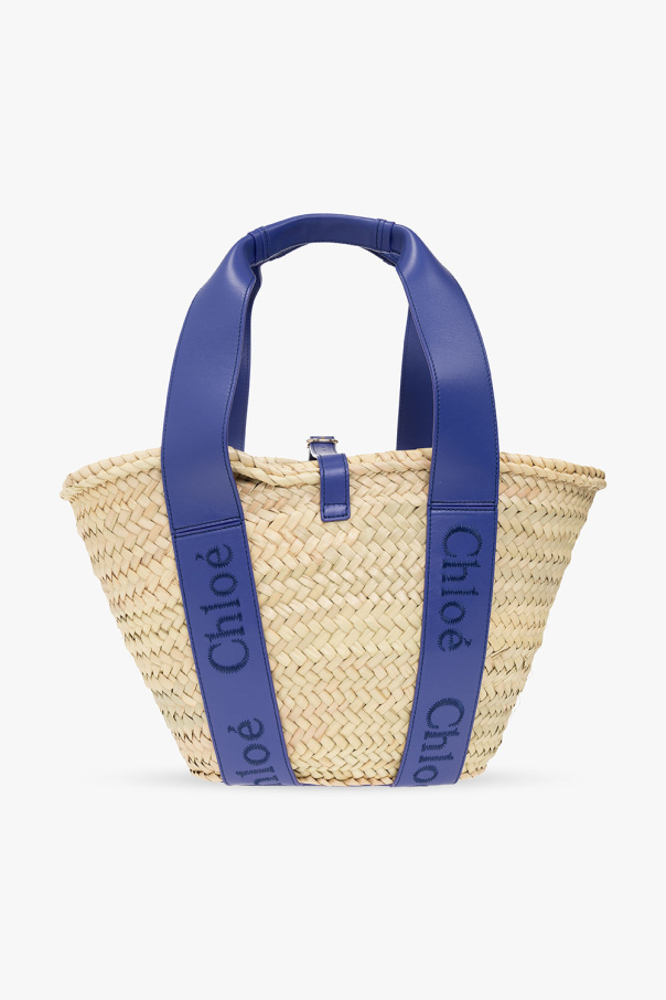 Beige and blueish purple ‘Chloé Sense Medium’ shopper bag from Chloé. Crafted from woven palm leaves and trimmed with calf leather, this design secures with an adjustable buckle strap and showcases an embroidered logo, two half-round straps, gold-tone metal hardware and one internal compartment.