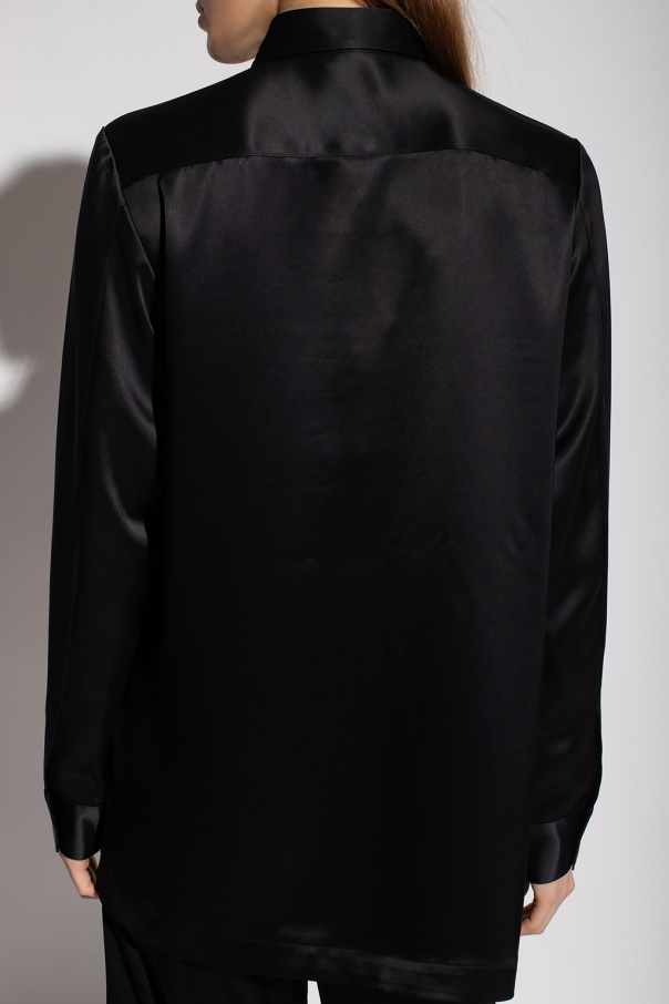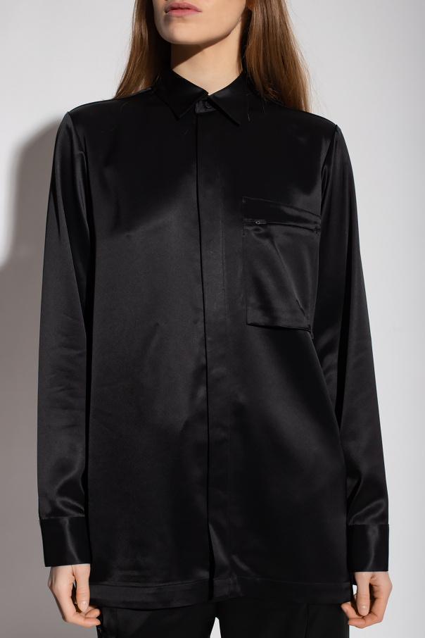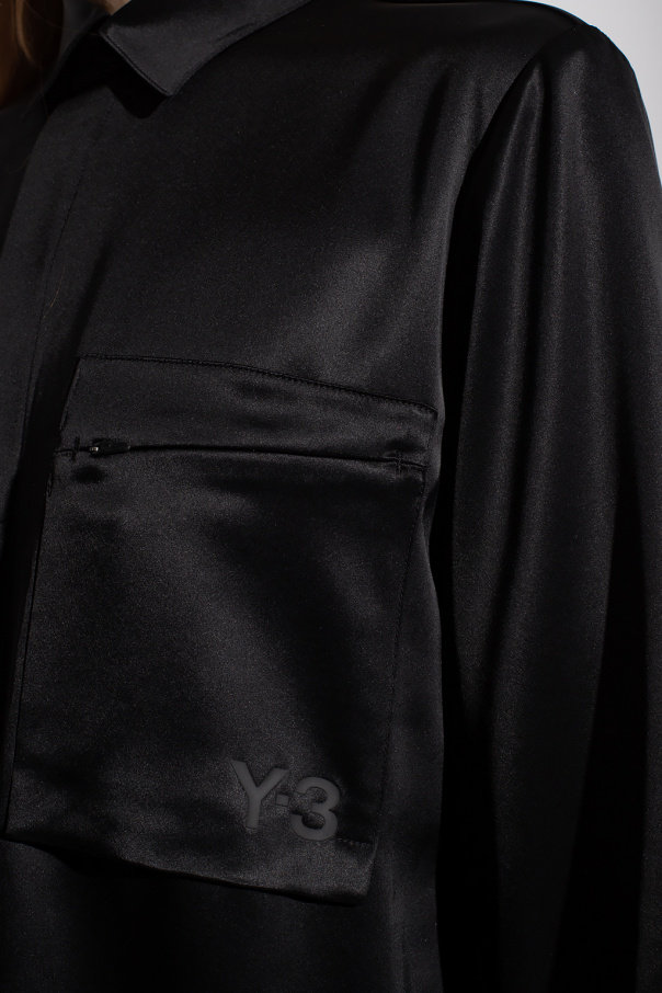 Black shirt from Y-3 Yohji Yamamoto. Embellished with a black logo print, this style features button fastenings with a concealed placket, one zip pocket and long sleeves with button cuffs.