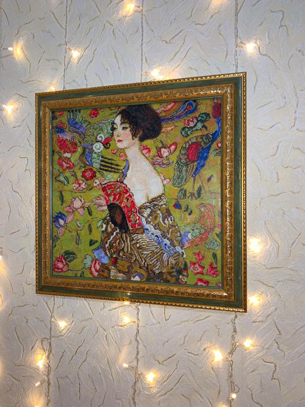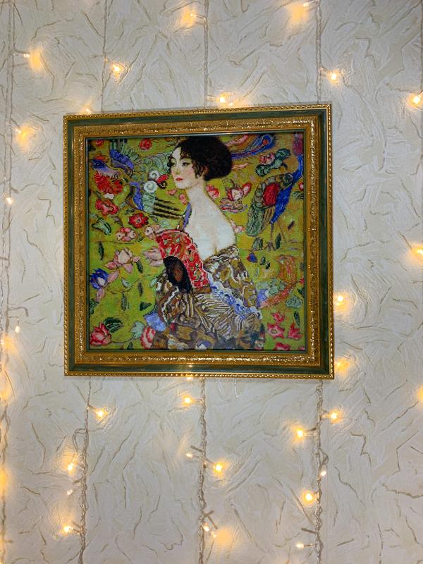 Картина "Дама с веером" по мотивам художника Г. Климта. Ручная работа, вышита крестиком. Размер с рамой: 44,5см Х 44см