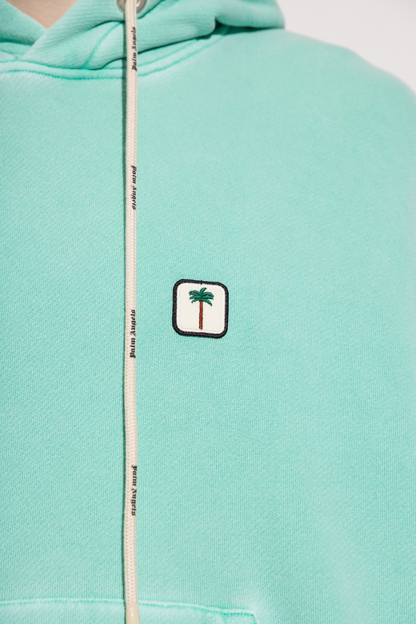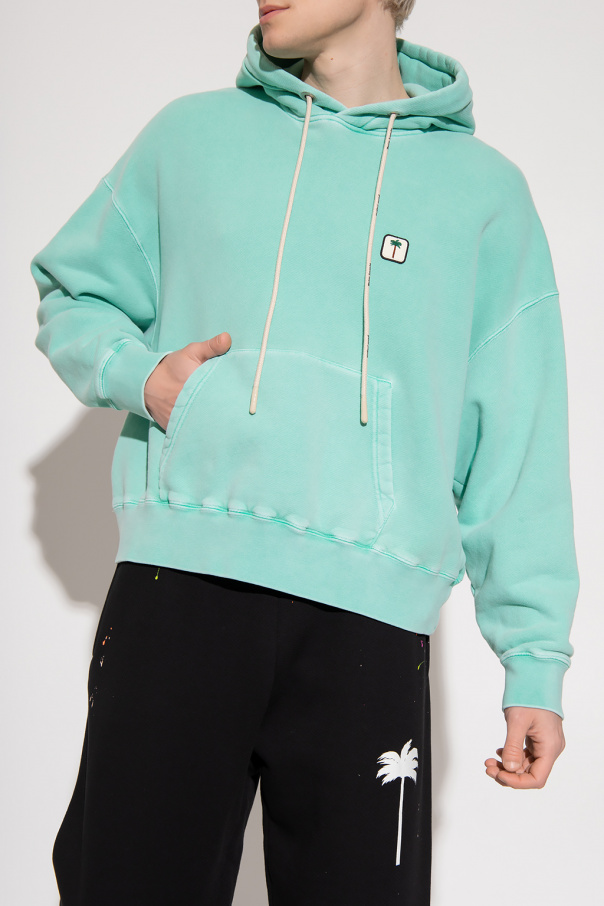 Light green hoodie from Palm Angels. Crafted from cotton, this garment features a hood with beige drawstrings printed with a black logo, front pocket, multicolored logo patch and ribbed trims at the hem and cuffs.