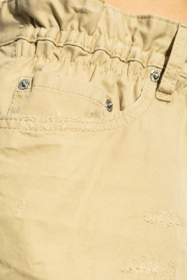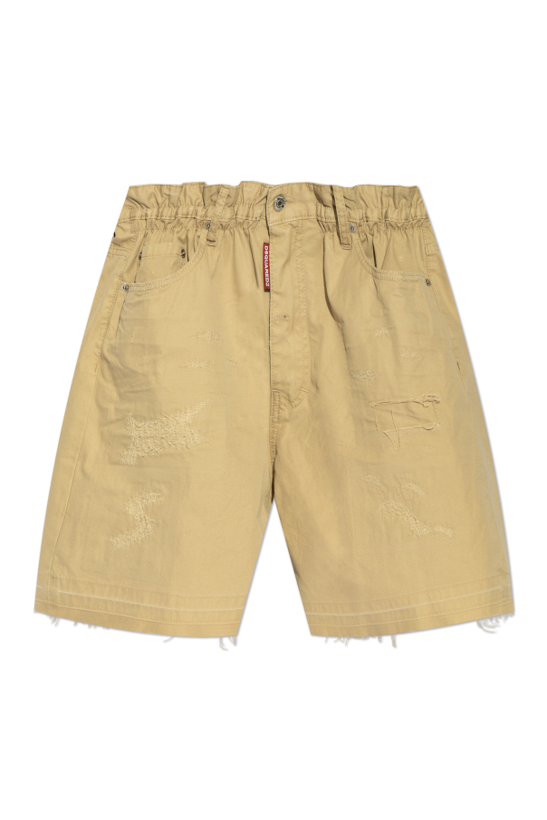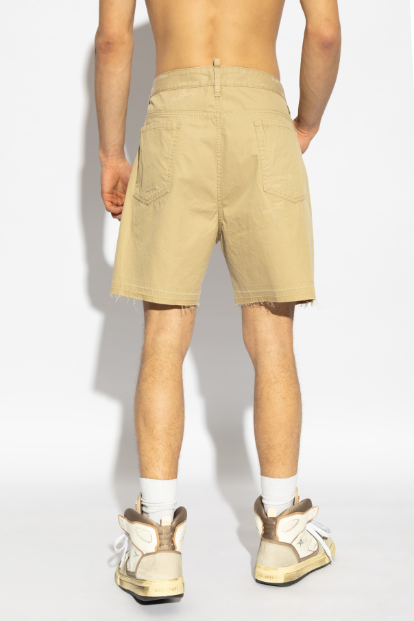 Introducing the Beige Logo Shorts from the exclusive collection by the renowned Dsquared2. This piece exemplifies a seamless blend of casual elegance and modern style, meticulously crafted for the discerning gentleman. These shorts, rendered in a distinguished beige hue, are fashioned from premium cotton, offering both comfort and durability. The loose fit, complemented by an elastic waistband, ensures unparalleled comfort. Details such as subtle distressing and raw-edged hems provide a fashionable, laid-back aesthetic. Featuring four strategically placed pockets—two at the front and two at the back—they combine functionality with style. A distinctive red patch with the logo adorns the front waistband, adding a touch of signature allure. Why Choose This Product? Exquisite craftsmanship from Dsquared2, pioneers of American glamour with Italian finesse. Perfectly balances casual and stylish ensembles. Unique detailing for a trendsetting look. Comfortable fit with button and zipper closure.