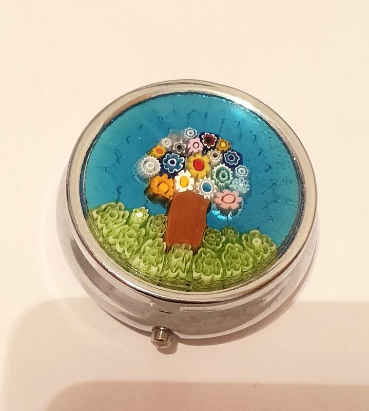 Шкатулка или таблетница из муранского стекла. На крышке выложен рисунок "Древо жизни" в технике millefiori. Небольшая, приблизительно 4 см в диаметре. Есть кулоны с таким же рисунком в разном диаметре.