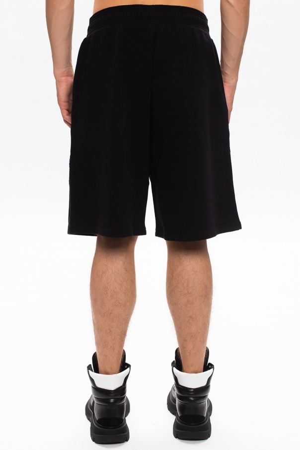 Black shorts from Givenchy. Embroidered with blue and white logo of the label, this cotton-crafted pair is complete with a drawstring waist and two side seam pockets.