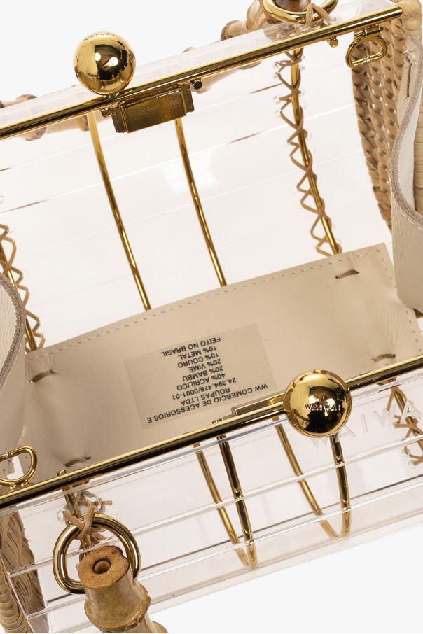 Transparent, round ‘Alix’ shoulder bag from Waiwai Rio. Crafted in handwoven beige rattan and acrylic tiles, this design showcases the brand\'s logo, a snap closure, two half-round bamboo handles, a detachable and adjustable leather shoulder strap accentuated with knots, gold-tone metal hardware and one internal compartment.