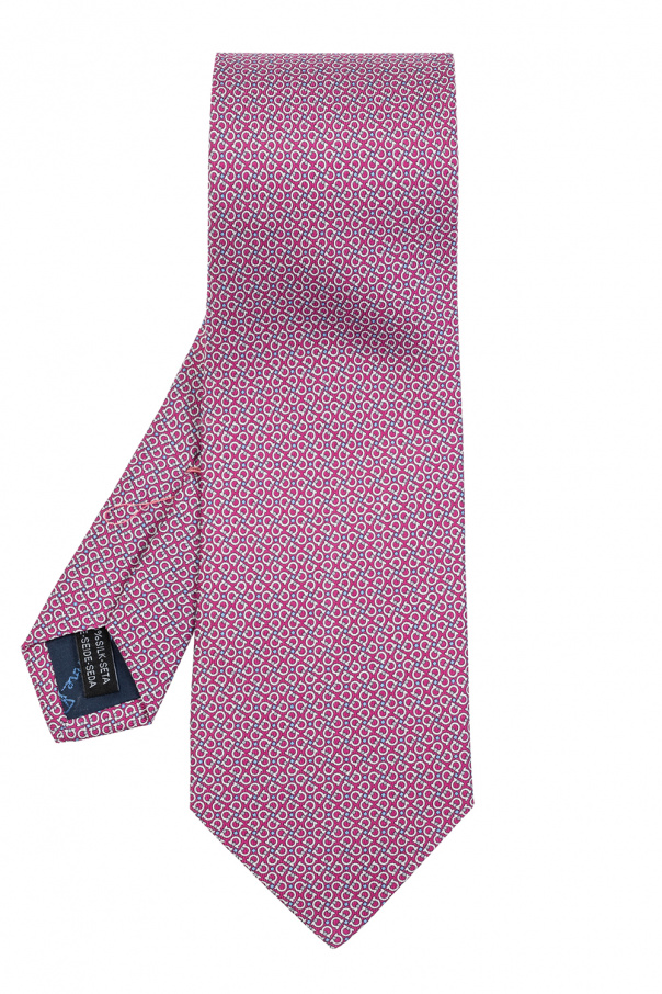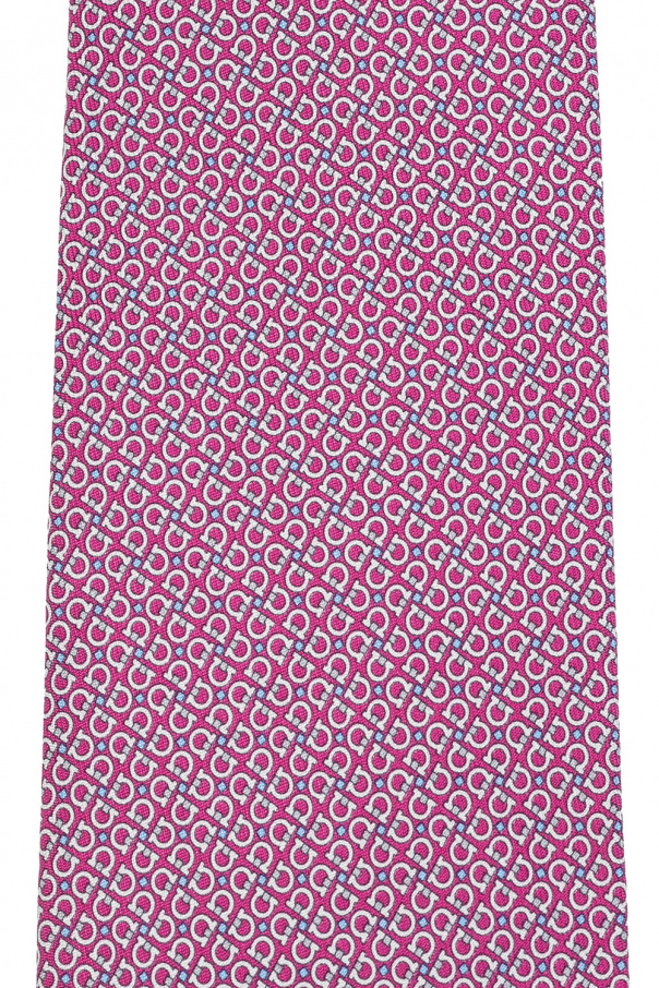 Pink tie from Salvatore Ferragamo. Crafted from silk, this design is decorated with a blue and grey logo print.