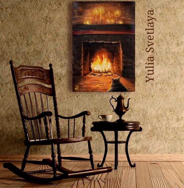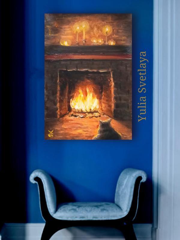 Картина камін, картина кіт, картина вогонь, картина багаття, картина піч, картина вечір.