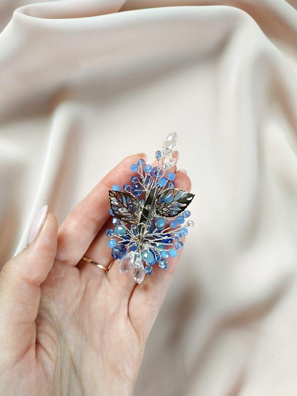 Изготовлена из ювелирной (нетемнеющей) проволоки, хрустальных бусин синего и голубого цветов, прозрачных бусин-капель, основы для брошей.