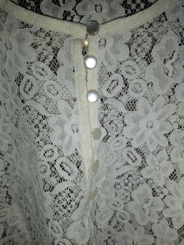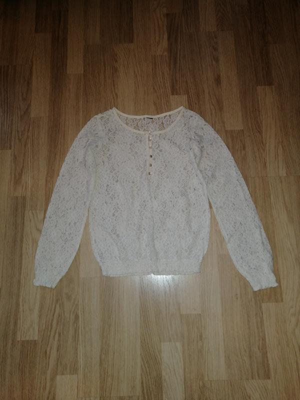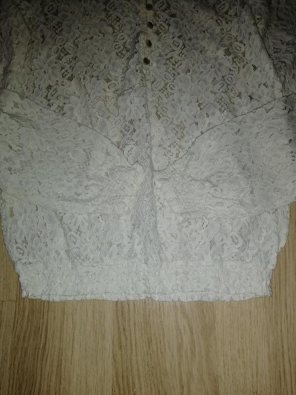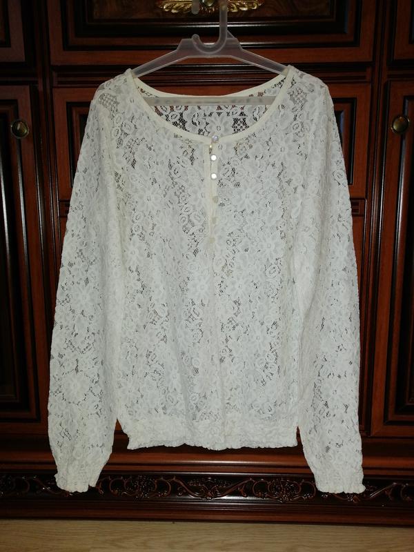 Гипюровая Блуза белая, р. 158-164. Застежка на пуговицах. Рукава и низ на манжетах-резинках. Свободная. Без подкладки. Без дефектов. Замеры: Длина - 60 см рукав - 63 см Обхват 82 см Вниз на резинке -64-72 см