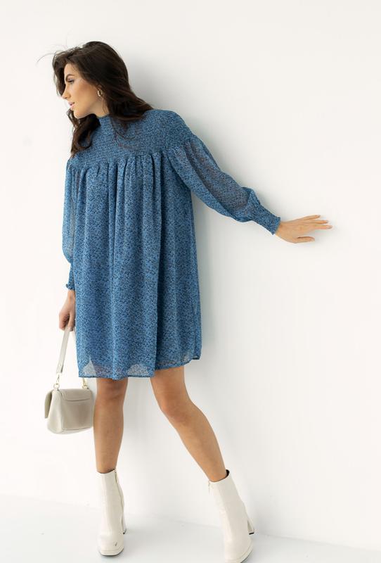Нежное, воздушное и очень женственное платье станет находкой для девушек, которые любят комплименты и захватывающие взгляды. Свободный фасон не сковывает движения и позволяет одевать ее девушкам любого телосложения. Модель представляет собой сочетание самых стильных дизайнерских решений. Чтобы создать незабываемое платье дизайнеры решили украсить изящный воротник-стойку, объемный рукав с манжетом по кисти и верх полочки тонкими резинками. Руки кажутся более изящными за счет узкого манжета, который плавно переходит в объемный фонарик. Актуальная длина мини, свободный силуэт делают образ с таким платьем воздушным, а облик – максимально женственным.