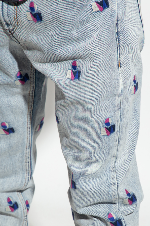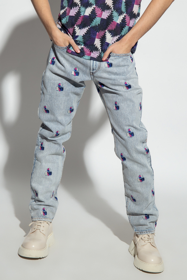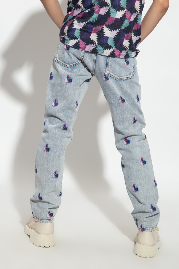 Blue ‘Jasperbo’ jeans from Isabel Marant. Made of cotton, this garment features a zip and button closure, multicolored embroidered logo pattern, five slip pockets and slightly tapered legs.