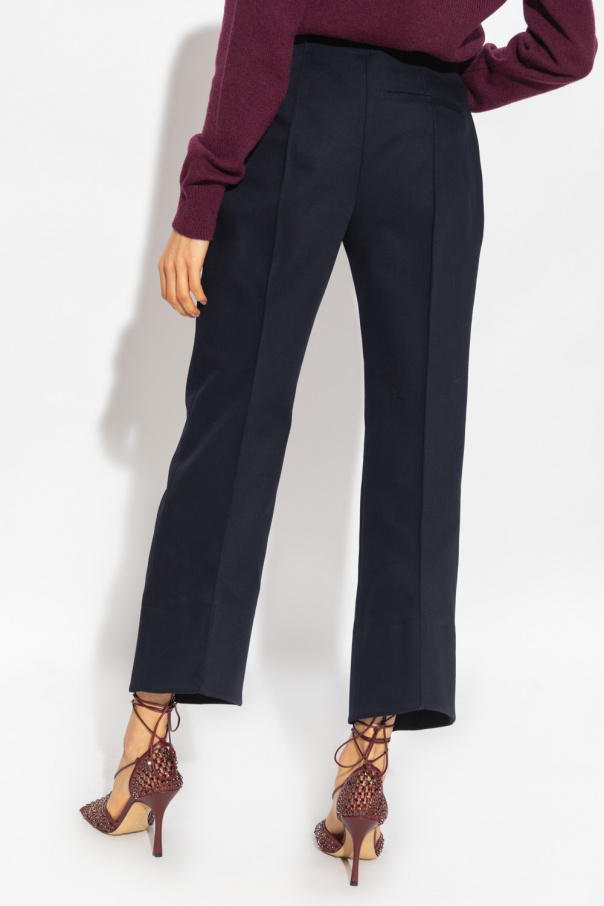 Navy blue pleat-front trousers from Bottega Veneta. Crafted from wool, this pair falls with wide, curved legs and features a zip fly with a button and hooks, two front slip pockets and one back slip pocket.