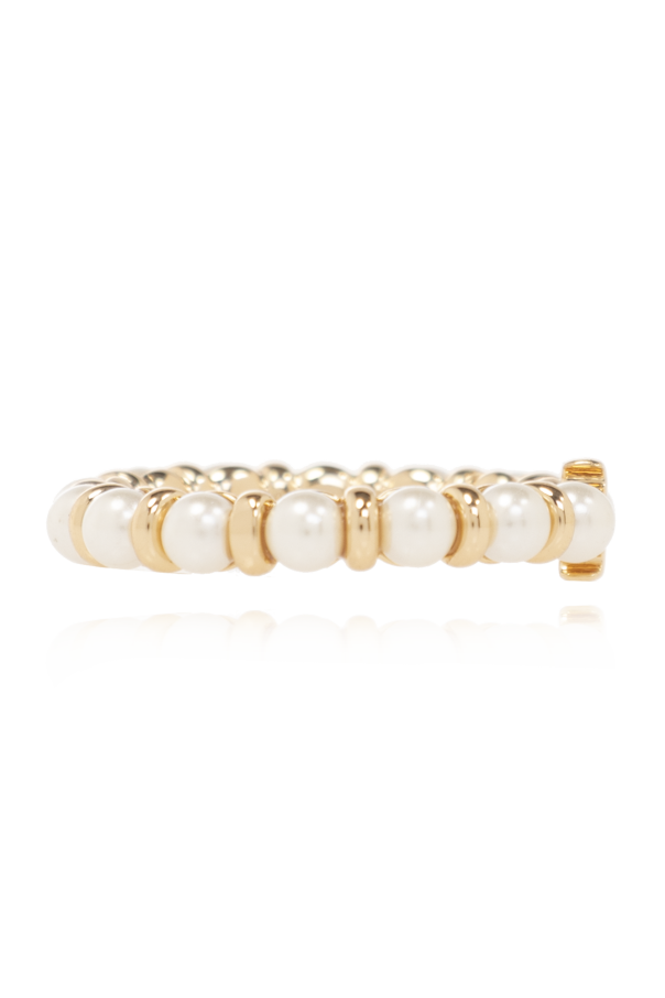 Gold-tone ring from Tory Burch. Made of brass, this design features white glass pearls and a logo.