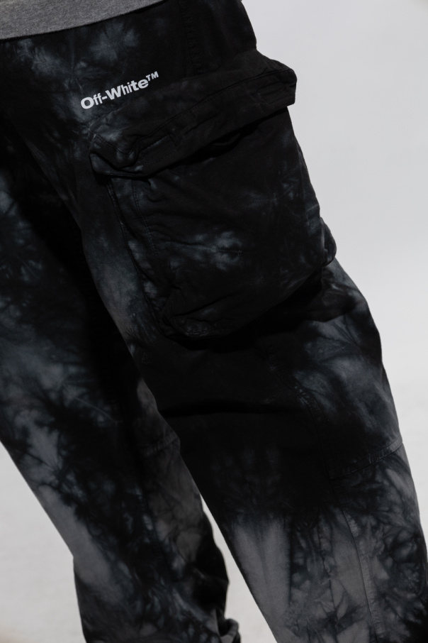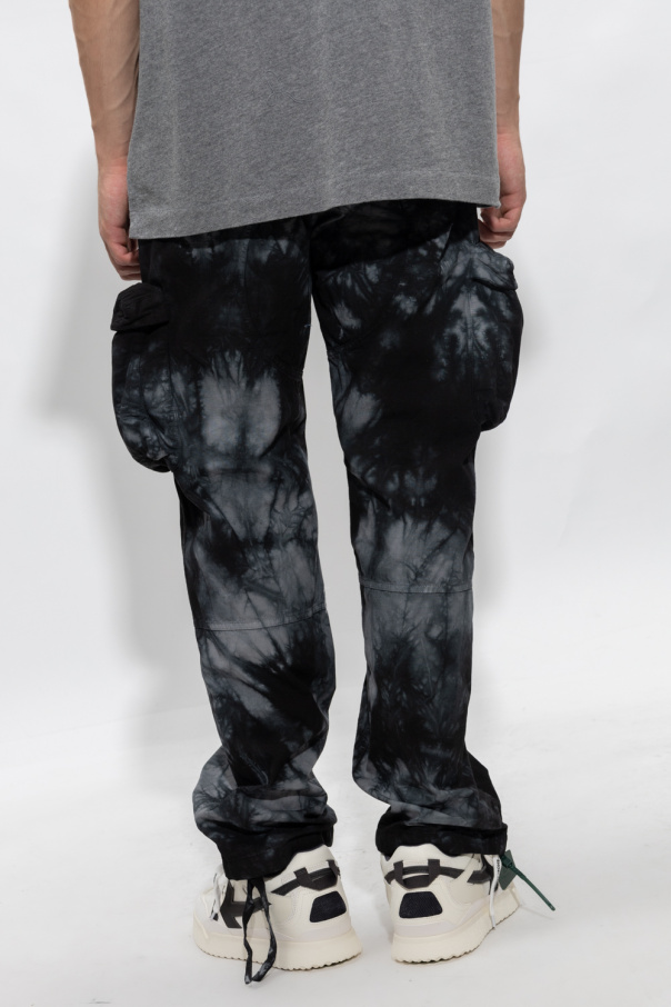 Black and grey trousers from Off-White. Crafted from tie-dyed cotton, this pair falls with straight legs and features a zip fly with a button and a hook, a printed logo and multiple pockets.
