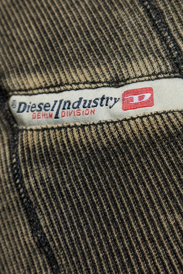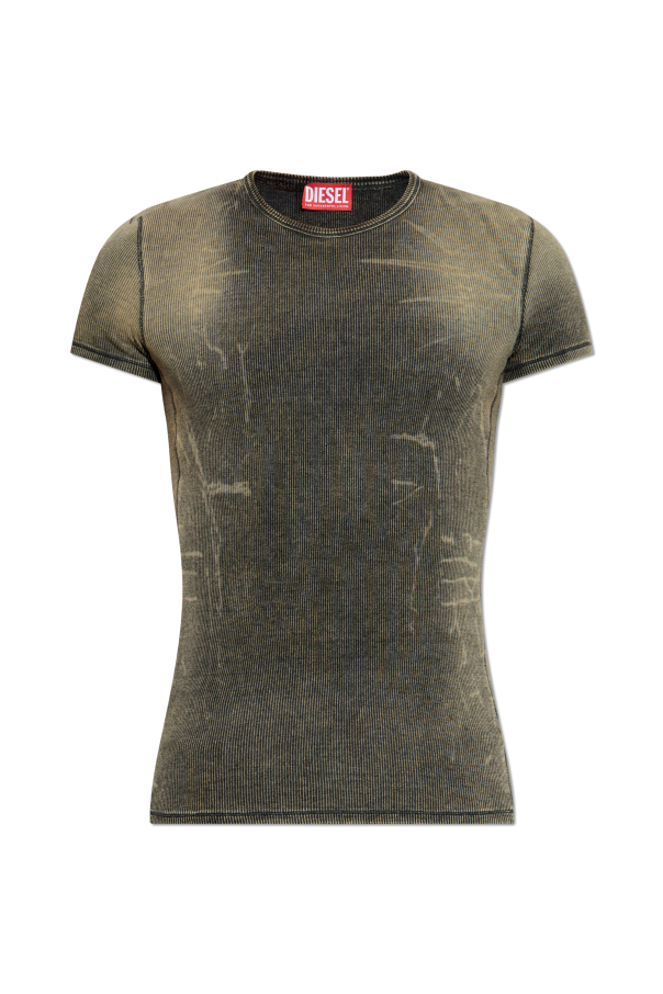 Introducing the Ribbed Top T-HANS by Diesel, a masterful blend of classic elegance and contemporary edge. This t-shirt is an embodiment of style, featuring a classic fit with short sleeves and a round neckline, artfully accentuating the physique with its ribbed texture. The top boasts a distinctive vintage-inspired distressed appearance, with a deep olive hue that exudes sophistication. The subtle ribbing adds depth and texture, enhancing the casual allure of this garment. Crafted from a premium blend of cotton and elastane, it promises both comfort and lasting quality. Embellished with the iconic \"Diesel Industry Denim Division\" patch in vivid red and white, this piece is a testament to authenticity and brand prestige. It is the quintessential wardrobe staple, effortlessly merging modern design with classic appeal. Dlaczego warto kupić ten produkt? Exclusive Design: Unique vintage look with a distressed finish. Premium Material: Crafted from high-quality cotton and elastane. Authenticity: Features the renowned Diesel logo patch. Versatile Fashion: Perfect for everyday wear with a touch of elegance.
