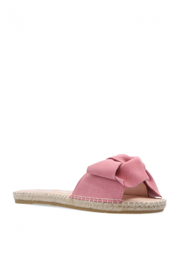 Pink ‘Hamptons’ slides from Manebi. Made of suede and decorated with a bow, this model sits on a natural jute sole with a thin rubber layer in beige.