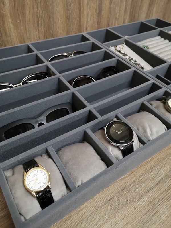 Вкладиші модулі для прикрас необхідні для дбайливого і компактного зберігання прикрас та аксесуарів.Конструкція складається індивідуально, за бажанням замовника. Такий модуль вміщує в себе окуляри, сережки, браслети, годинник, запонки, і інші аксесуари.