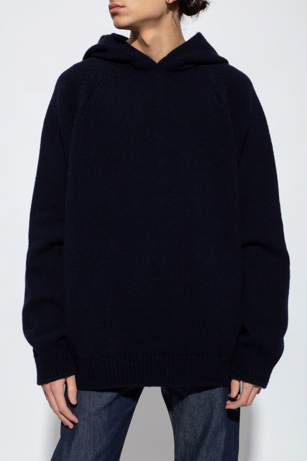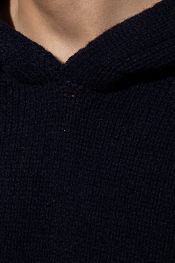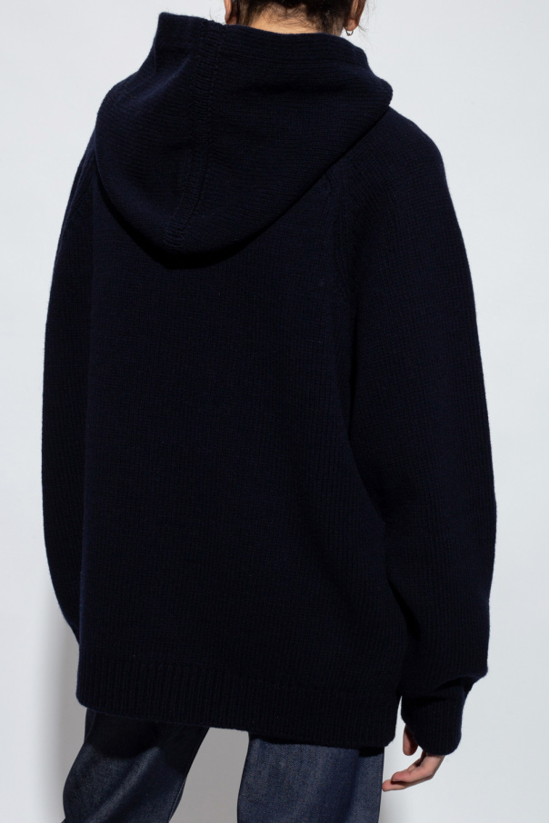 Navy ‘Tapia’ hooded sweater with long sleeves from Nanushka. Knitted from a wool and cashmere blend.