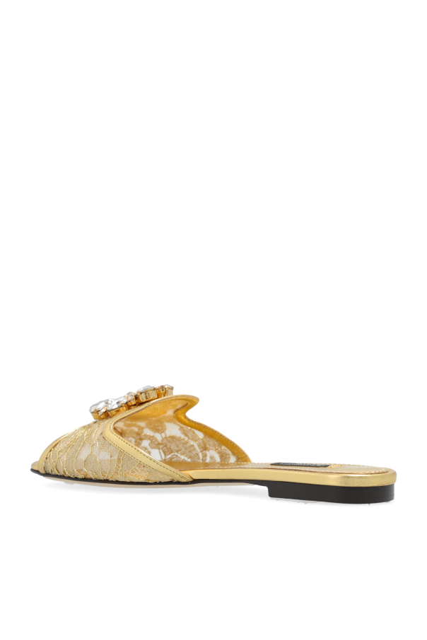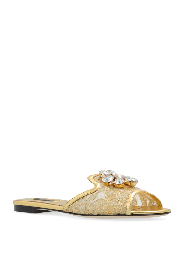 Introducing the epitome of luxury and elegance, the Bianca slippers by renowned designer Dolce & Gabbana. Crafted with meticulous attention to detail, these slippers are a harmonious blend of comfort and opulence, designed to elevate your footwear collection. The Bianca slippers dazzle in a captivating golden hue, with a surface that glistens in any light, thanks to its metallic or glitter-infused material. This lustrous finish not only bestows the slippers with a regal appearance but also accentuates their luxurious character. A subtle, textured pattern adorns the material, reminiscent of finely woven fabric or delicate glitter, adding depth and sophistication to the design. Adorning the top is a striking, floral motif embellished with crystals and stones, an exquisite detail that captures the eye and underscores the exclusivity of these slippers. The design features a wide strap across the midfoot, providing both comfort and a chic aesthetic, while the open front enhances its stylish appeal. A flat sole ensures ease of wear, making these slippers a perfect blend of fashion and functionality. Notably, the inner side of the slipper bears the Dolce & Gabbana logo, a mark of authenticity and luxury that distinguishes these slippers as a high-caliber product. Why Purchase the Bianca Slippers? Elegant, golden hue that exudes luxury and sophistication. Exquisite crystal and stone floral motif that enhances visual appeal. Comfortable design with a chic, wide strap and open front. Flat sole for effortless wearability. Signature Dolce & Gabbana logo as a hallmark of quality and authenticity.