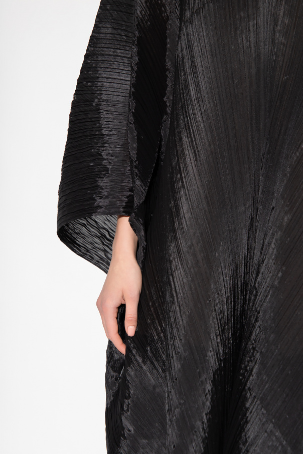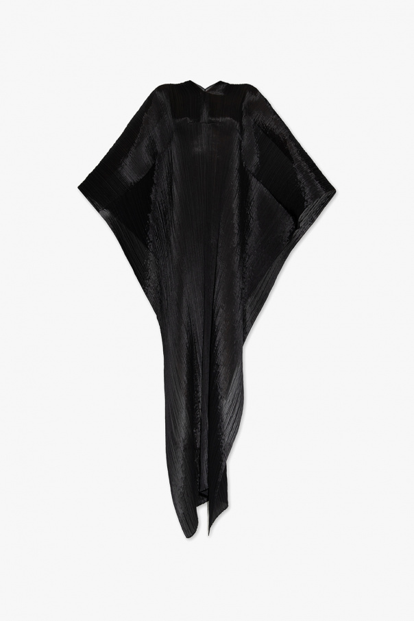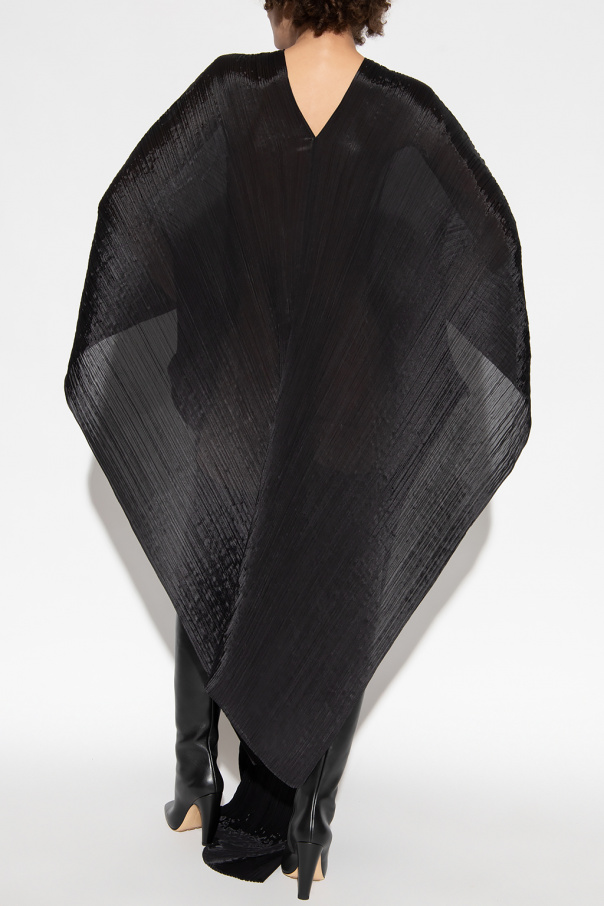 Black poncho from Issey Miyake Pleats Please. Distinguished by pleats, this style features an asymmetrical silhouette with a round neck.