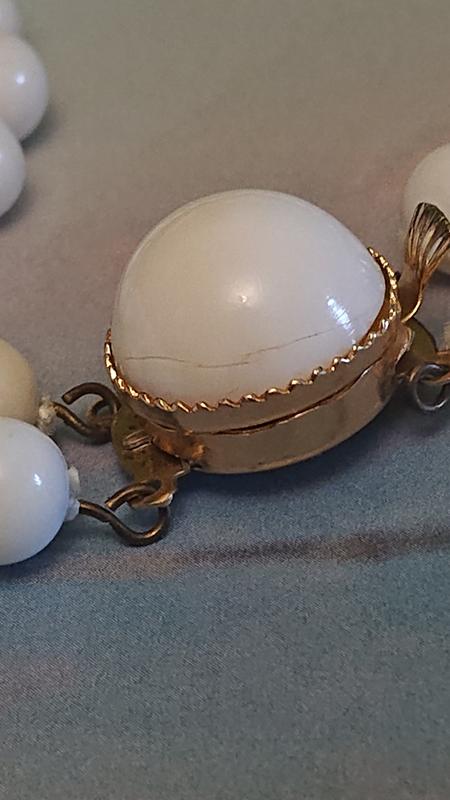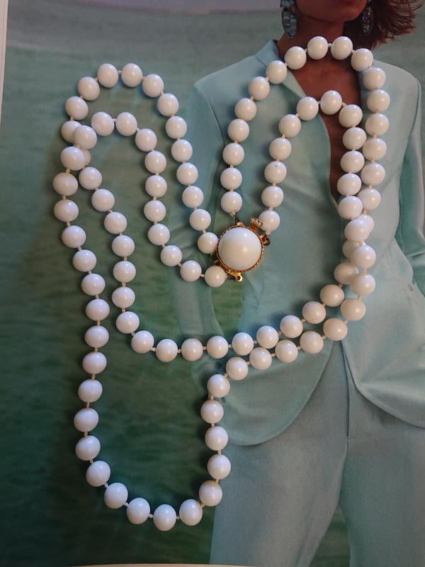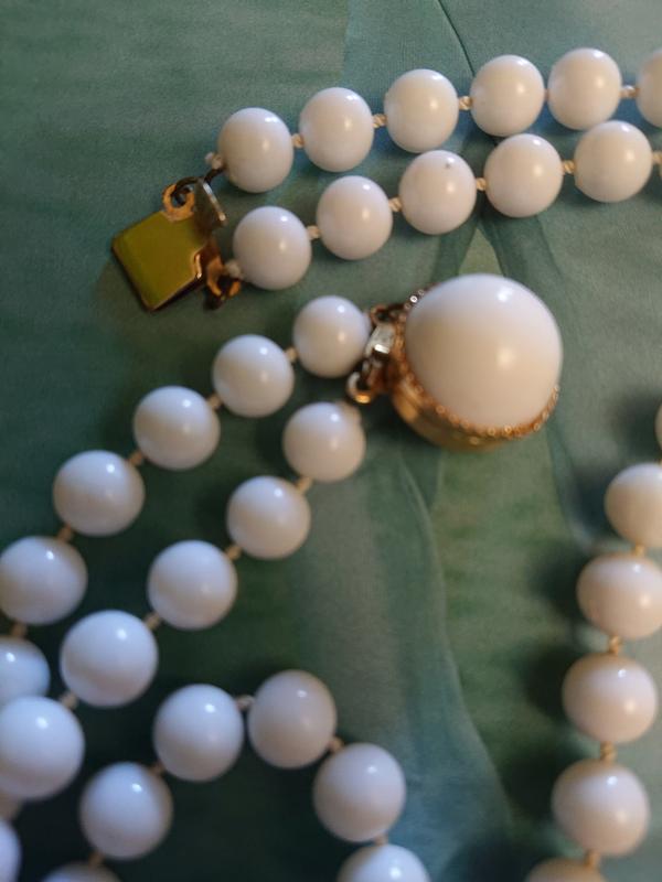 Классические белые пластиковые двухрядные бусы. Невесомые и очень приятные в руке. Маркированы Hong Kong. Бусины в отличном состоянии, замок рабочий, но на нем присутствуют следы времени, смотри фото.