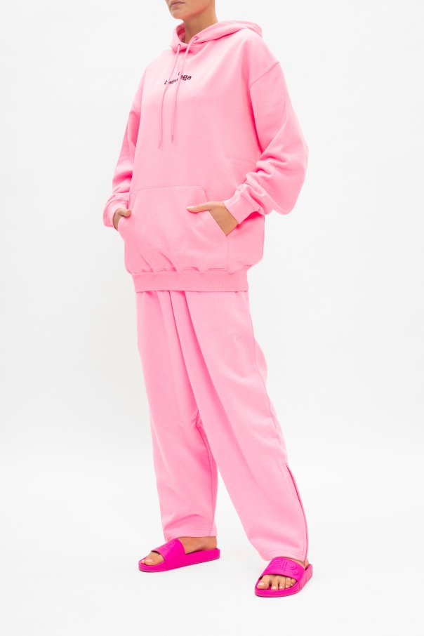 Pink slides from Balenciaga. Showcasing tactile logo detail, this leather-crafted pair rests on a pink rubber sole.