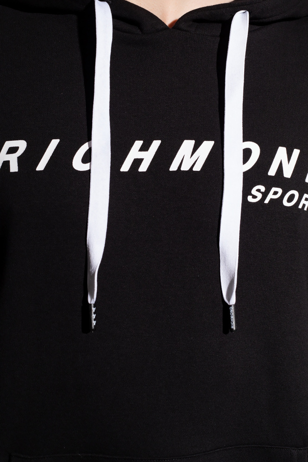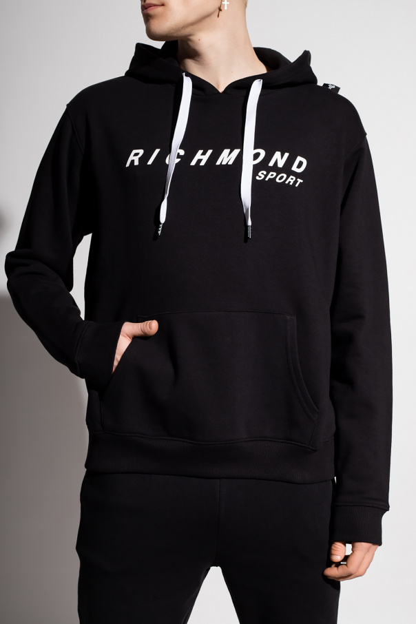 Black sweatshirt with a drawcord-adjustable hood from John Richmond. Made of cotton jersey, this style showcases a white logo print, two slip pockets and a ribbed bottom hem and cuffs.