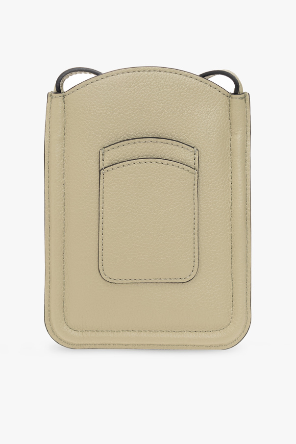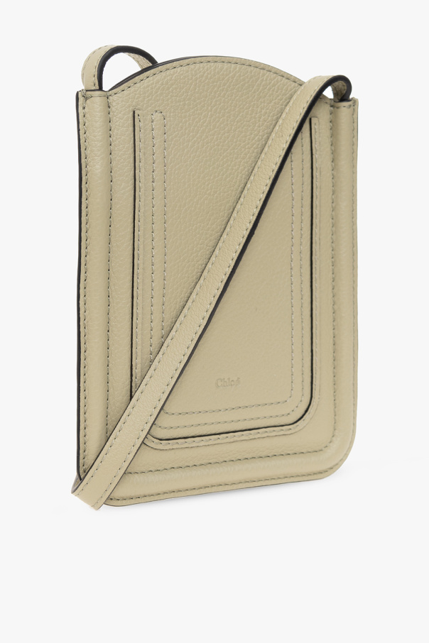 Green ‘Marcie’ phone pouch from Chloé. Made of calf leather, this model features decorative stitching detail, embossed logo, two card slots at the back, tied strap and one internal compartment.