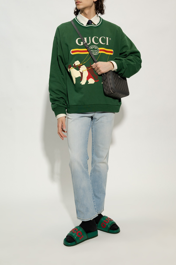 Green slides from Gucci. Made of leather, this model sits on a green rubber sole and showcases a tactile logo in red.