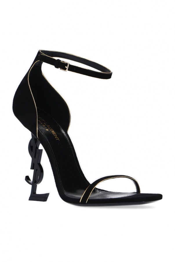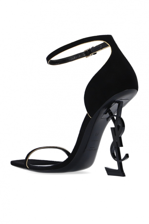 Black and gold-tone ‘Opyum’ sandals from Saint Laurent. Crafted from suede, this unique pair fastens via buckle strap at the ankle and showcases a distinctive interlocking YSL logo heel.