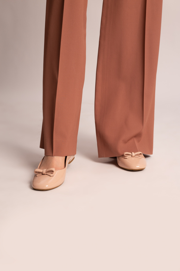 Beige \'Kiersten\' ballet flats from Kate Spade. Crafted from patent leather, this pair sits on a brown rubber sole and showcases the brand\'s logo and a decorative bow on the front.