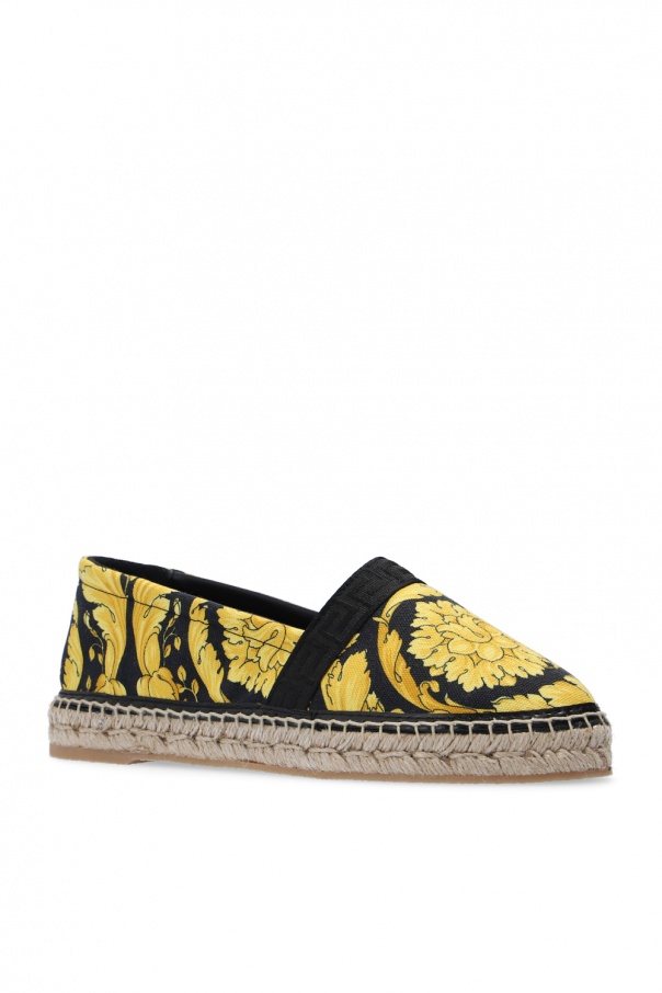 Black and yellow espadrilles from Versace. Crafted from leather, this pair features a logo print with the Barocco motif and a beige rubber sole.
