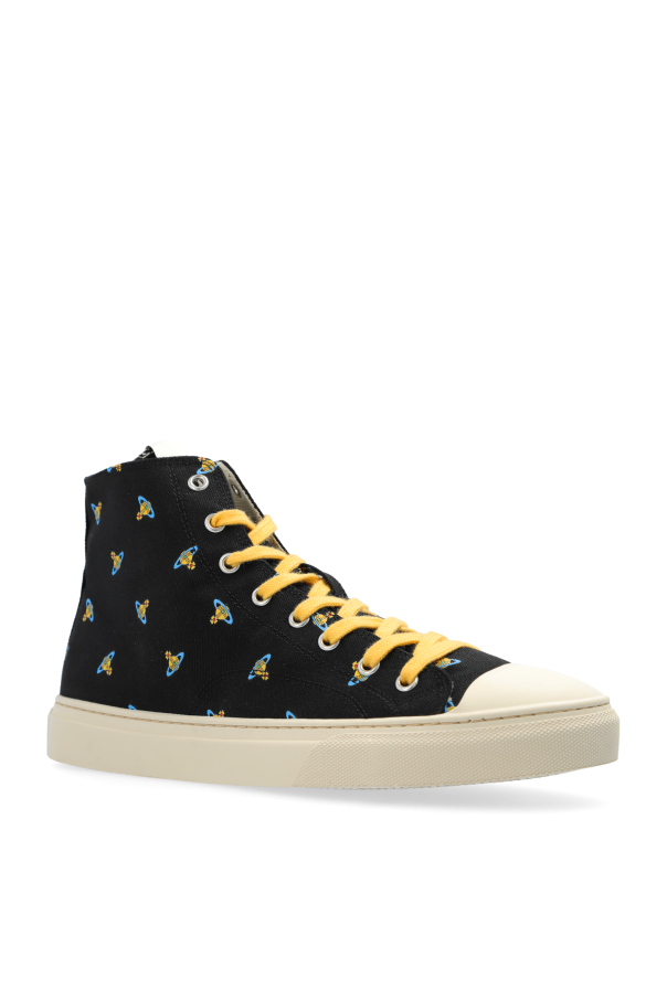 Introducing the Plimsoll High Top by the iconic designer Vivienne Westwood – an epitome of avant-garde elegance and athletic sophistication. Crafted to perfection, these exclusive high-top sneakers are a harmonious blend of style and comfort, designed for those who dare to stand out. Rendered in a dominant black hue, the classic high-top silhouette is adorned with intricate blue and yellow graphics that add a dash of vibrant flair. The exterior, meticulously fashioned from premium textile material, guarantees breathability and ultimate comfort. Key features include striking yellow laces that contrast elegantly with the black upper, and a robust white rubber sole that ensures superior grip and durability. The interior is luxuriously lined to provide an unparalleled wearing experience, making these sneakers as comfortable as they are stylish. The designer’s logo, prominently displayed on the tongue, is a testament to the exclusivity and prestige of this remarkable piece. Why Choose the Plimsoll High Top? Exquisite design by Vivienne Westwood Unique blue and yellow graphic prints Contrasting yellow laces with additional spares included Comfortable, breathable textile material Durable white rubber sole for enhanced grip Luxuriously lined interior for maximum comfort