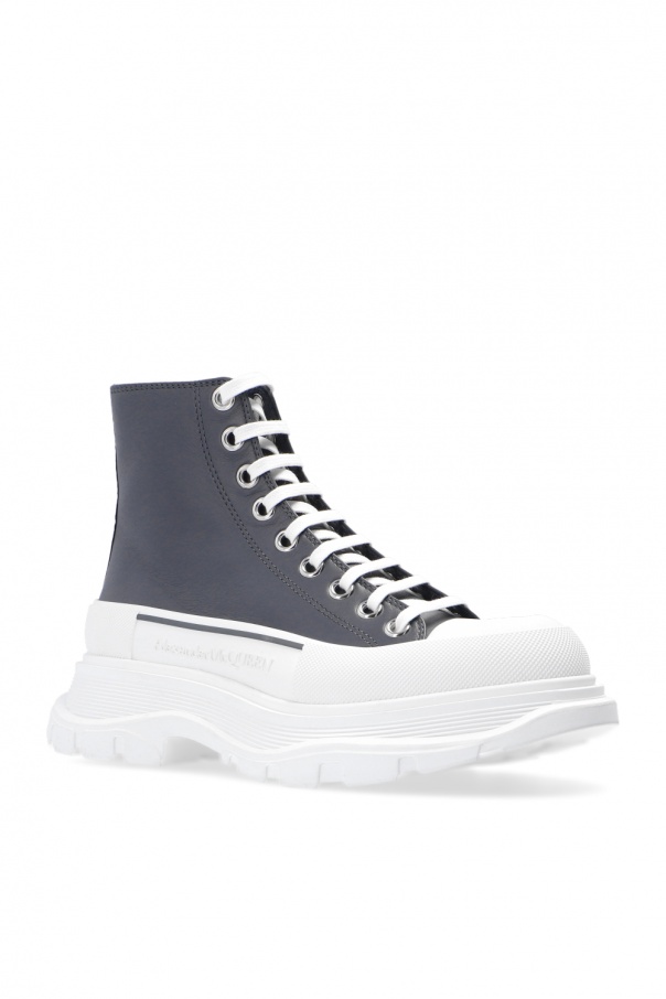 Grey and white sneakers from Alexander McQueen. Boasting a high-top silhouette, this leather-crafted pair sits on a white rubber sole and features lace-up front and logo-embossed rubberised accents.