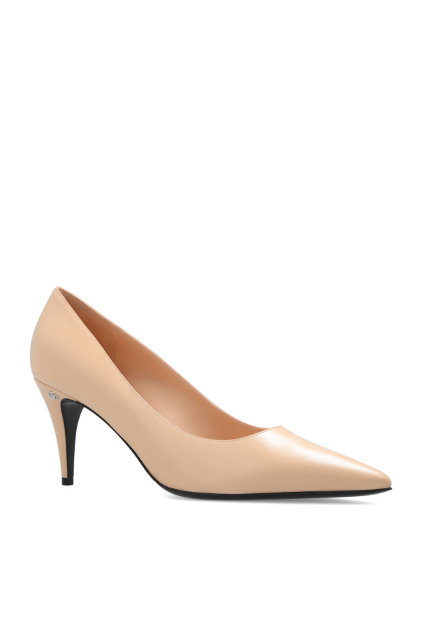 Beige stiletto pumps from Gucci. Made of leather, this pair features a GG logo detail at the heel, pointed toe and black leather sole.