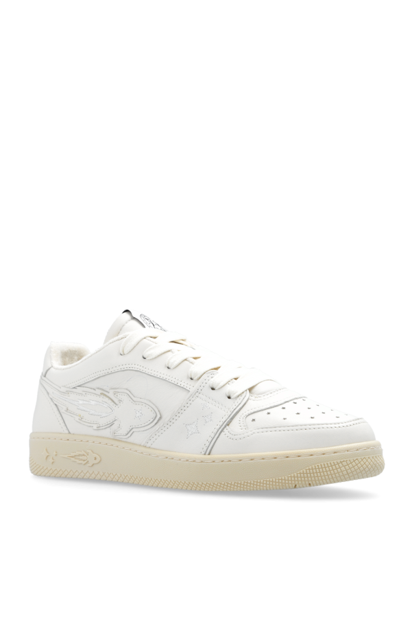 Cream ‘EJ Egg Rocket’ sneakers from Enterprise Japan. Made of leather and suede, this lace-up model sits on a cream rubber sole and showcases a patch, perforations on the front as well as a raw-trimmed tongue and an embroidered logo pattern.