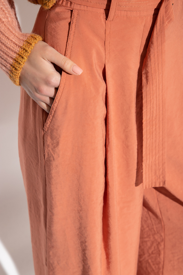 Light red high-waisted ‘Lydia’ trousers from Ulla Johnson. Fastened with a zip, hook and button, this wide leg pair is complete with an adjustable waist belt, two front pockets and two back pockets.