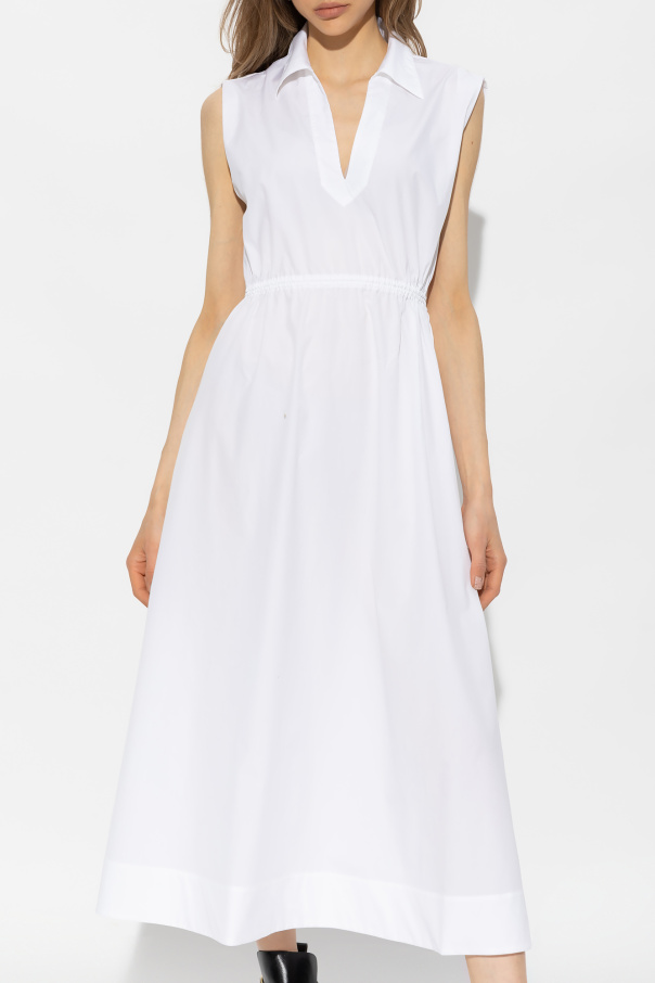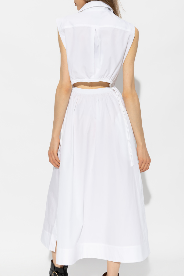White ‘Soraya’ sleeveless dress from Rag & Bone. Made of cotton, this style is cinched with drawstrings at the waist and features a V-neckline with an open collar, cutout detail at the back and a flared hem with two slip pockets.